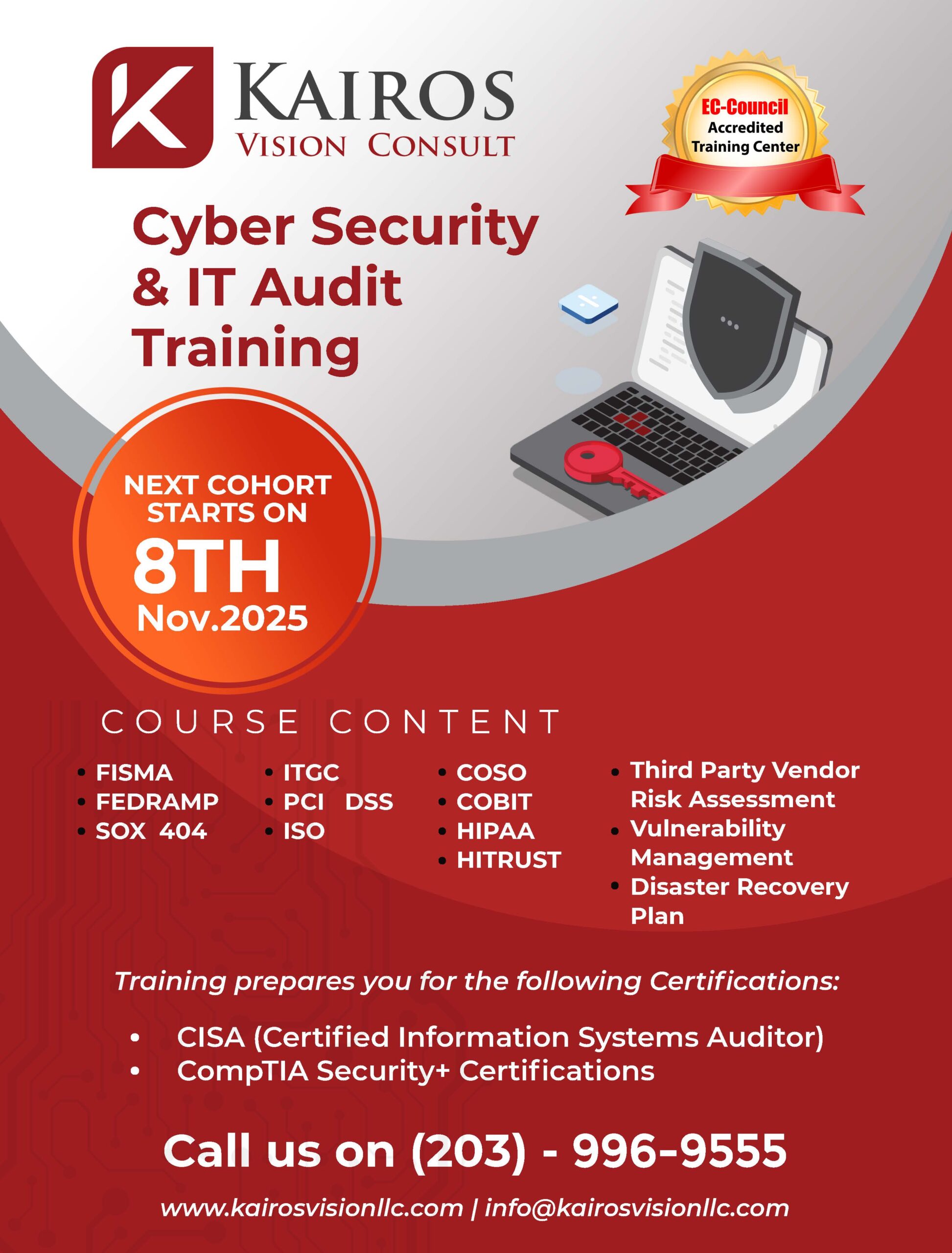 The Training at Kairos Vision Consult prepares our clients in the areas of Information Security (Cyber security), Risk Assessment, Auditing and Compliance. Our Training covers the following Industry Standard Frameworks.